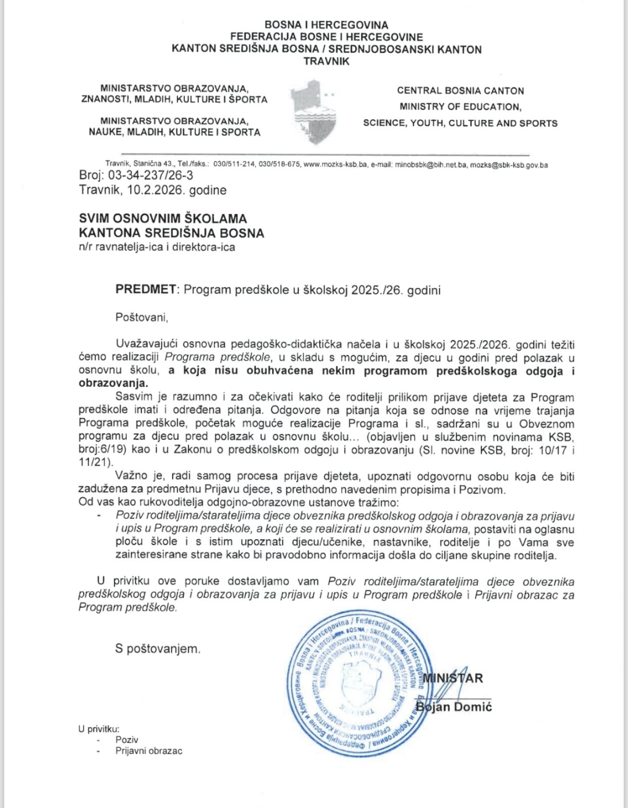 Na temelju članka 18., točke e) stavka (1) članka 35. i članka 78. Zakona o predškolskom odgoju i obrazovanju („Službene novine Kantona Središnja Bosna“, broj 10/17 i 11/21) te točke VII. Obveznoga programa za djecu u godini pred polazak u školu ako nisu obuhvaćena nekim programom predškolskoga odgoja i obrazovanja („Službene novine Kantona Središnja Bosna“, broj 6/19), Ministarstvo obrazovanja, znanosti, mladih, kulture i športa Kantona Središnja Bosna upućuje