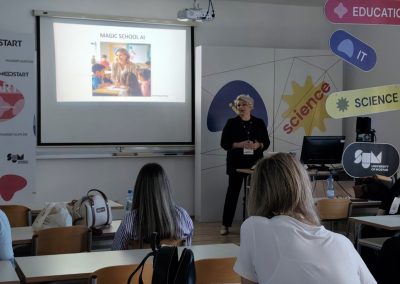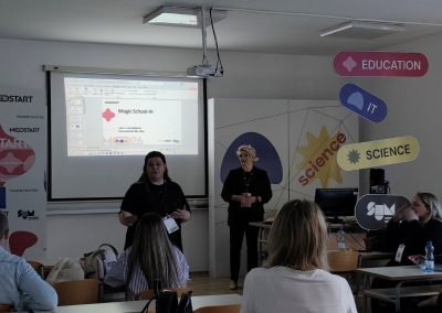 Među predavačima Obrazovnog dana bile su djelatnice naše škole, učiteljice Kristina Katava-Mlakić i Eva Rajković, koje su prezentirale praktične korake u radu s alatima umjetne inteligencije. Njihova prezentacija ponudila je konkretne primjere i inspirativne ideje kako AI alati mogu postati svakodnevni pomagači u učionici – od razvoja digitalnih projekata, preko prilagođene podrške učenicima, do sigurnog i odgovornog korištenja novih tehnologija.