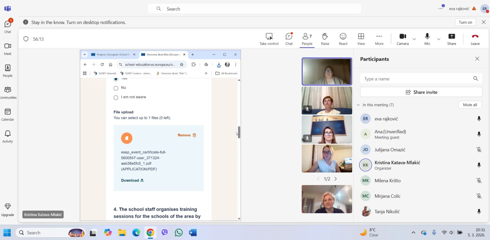 Tijekom sastanka analizirani su svi prikupljeni materijali i dokumentacija koji potvrđuju aktivno sudjelovanje škole u eTwinning projektima, suradnju nastavnika i učenika unutar škole kao i  aktivne međunarodne suradnje učenika s vršnjacima iz škola partnera u projektima korištenjem inovativnih metoda poučavanja i primjenu digitalnih alata u nastavi.